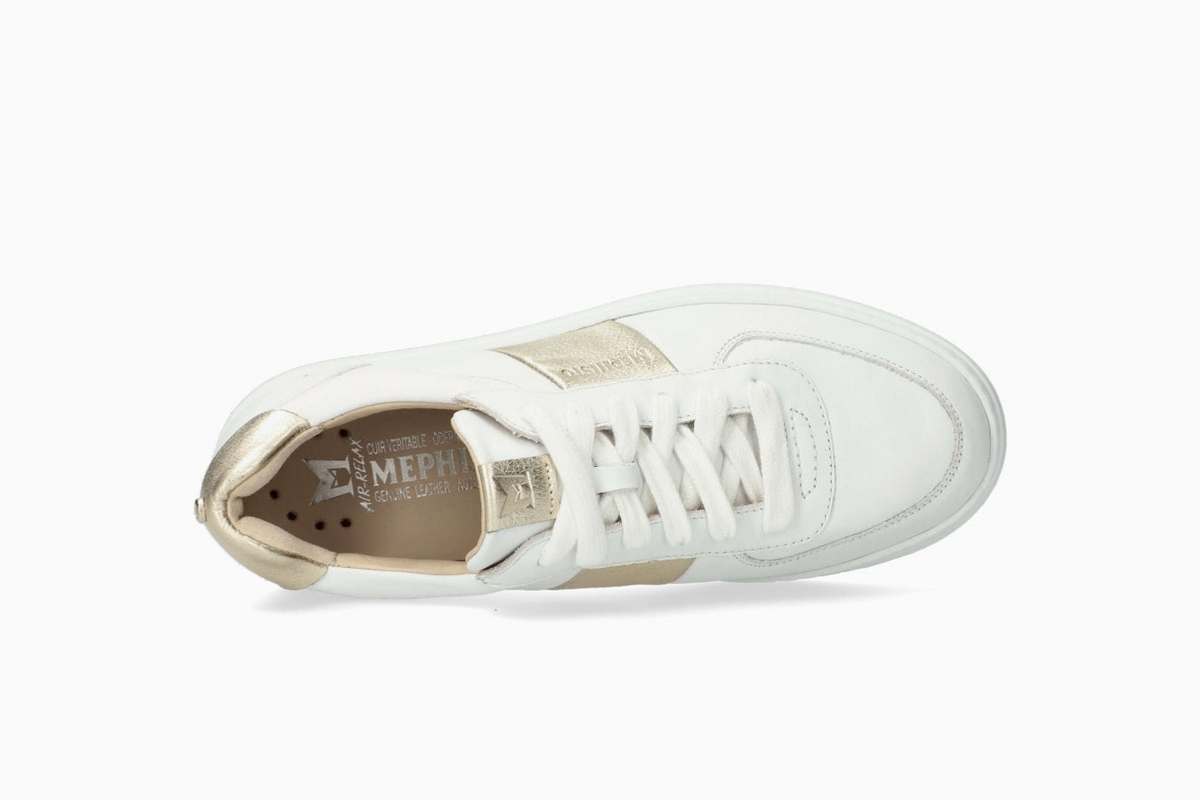 This comfortable sneaker is a classic wardrobe staple that pairs effortlessly with any outfit. The SHOCK-ABSORBER in the outsole, together with the removable insole featuring SOFT-AIR Technology, minimizes impact while maintaining a healthy internal climate. AIR-RELAX technology supports the natural anatomy of the foot, helping to prevent arch collapse. The lace-up design allows for precise adjustment and optimal foot support. A leather lining ensures excellent foot hygiene. This white women’s model is crafted from smooth leather across the foot, accented with smooth grained leather featuring a metallic effect on the sides and heel.